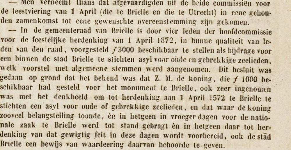 Op 1 april 1572 werd Brielle door de watergeuzen ingenomen. Op 21 februari 1872 werd d.m.v. een circulatie de bewoners van Brielle op de hoogte gebracht dat in het vervolg 1 april een nationale feestdag in Brielle zal zijn. Want binnenkort zou het 300 jaar geleden zijn dat, na 80 jaar lijden, de eerste triomf behaalde in de strijd tegen de Spanjaarden. De wens van vorst en volk was de vrijheid te behouden. Maar Brielle had echter nog enkele wensen: een monument oprichten en het stichten van een Asyl voor oude en verminkte Nederlandse zeelieden. Beiden met het doel om het nageslacht te laten zien hoe belangrijk de inneming van Den Briel door de watergeuzen was geweest.