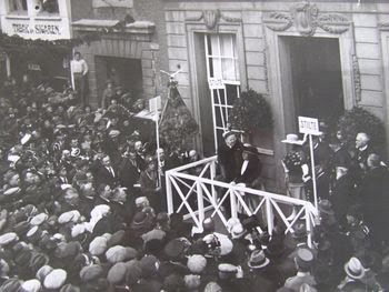 ’s Middags spreekt zij vanaf het podium voor het stadhuis de Brielse bevolking toe.