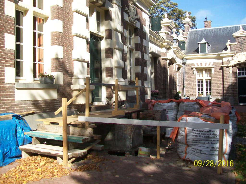 Het bordes in het midden van het hoofdgebouw met de trap en de leeuwen waren aan het verzakken. Dit was mogelijk omdat het geheel tijdens de bouw niet is onderheid. De deskundigen hebben besloten verder verzakken te voorkomen door een betonnen plaat onder het bordes aan te brengen die het geheel draagt. Deze plaat is onderheid.